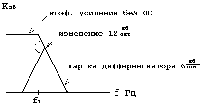 Схема имеет тенденции к потере устойчивости в той области частот, где частотная характеристика дифференциатора (имеющая подъем 6 дб/окт ) пересекается с имеющей спад 6 дб.окт характеристикой скорректированного уcилителя.