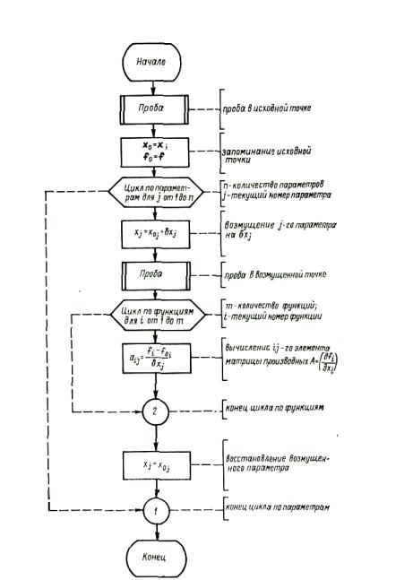 При этом способе производные характеристик по параметрам вычисляются в процессе выполнения пробы по аналитическим выражениям. Это способствует не только существенному сокращению количества операций при вычислении производных, но и повышению точности вычисления за счет устранения погрешности округления, являющейся одним из основных источников погрешности при численном дифференцировании. Естественно, что формулы аналитического дифференцирования самым тесным образом связаны с теми алгоритмами, которые дифференцируются, т. е. с внутренним содержанием пробы. Будем называть поэтому алгоритм вычисления матрицы А, построенный на аналитических формулах, внутренней пробой производных. Как мы уже отмечали, достоинствами внутренней пробы производных, по сравнению с внешней, являются меньшая трудоемкость и меньшая зависимость от точности ЭВМ; недостатками же - отсутствие универсальности, значительная сложность алгоритма и приближенный характер некоторых производных, обусловленный пренебрежением некоторыми факторами с целью упрощения формул.