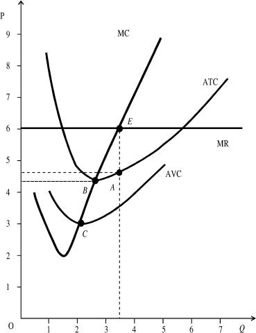 Используя имеющиеся расчеты изобразим графически кривые MC, ATC и AVC. Точка пересечения кривой предельных затрат и предельного дохода (рис. 98 - точка E) даст оптимальный объем выпуска (Q = 3). Пересечение перпендикуляра опущенного из точки E на ось абсцисс с кривой ATC (точка A) укажет величину затрат на единицу продукции (по графику это - 4, 7 ден. ед.) исходя из полученных данных, можно определить, что: